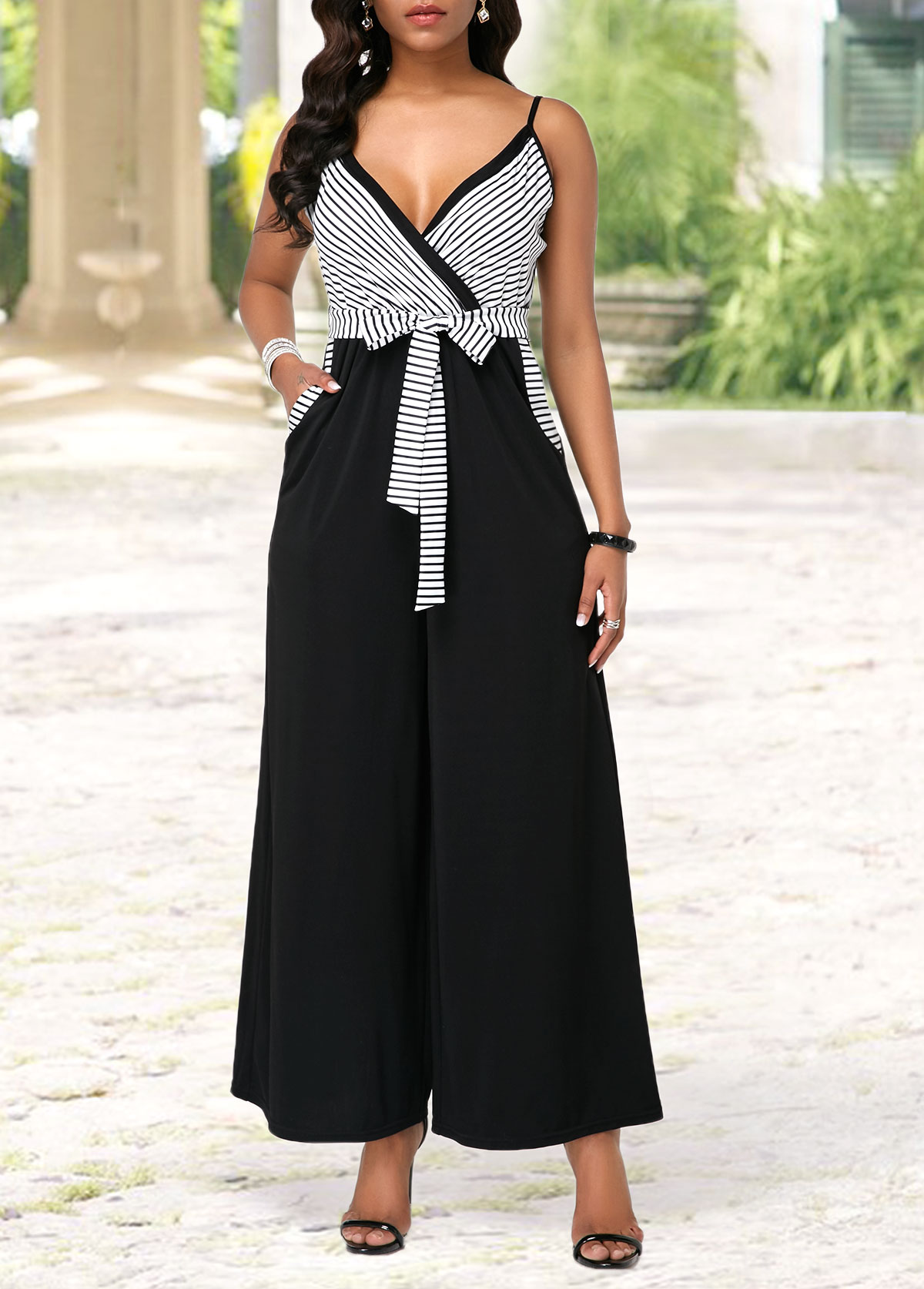 / Amazing Stripe Print Spaghetti Strap Belted Jumpsuit