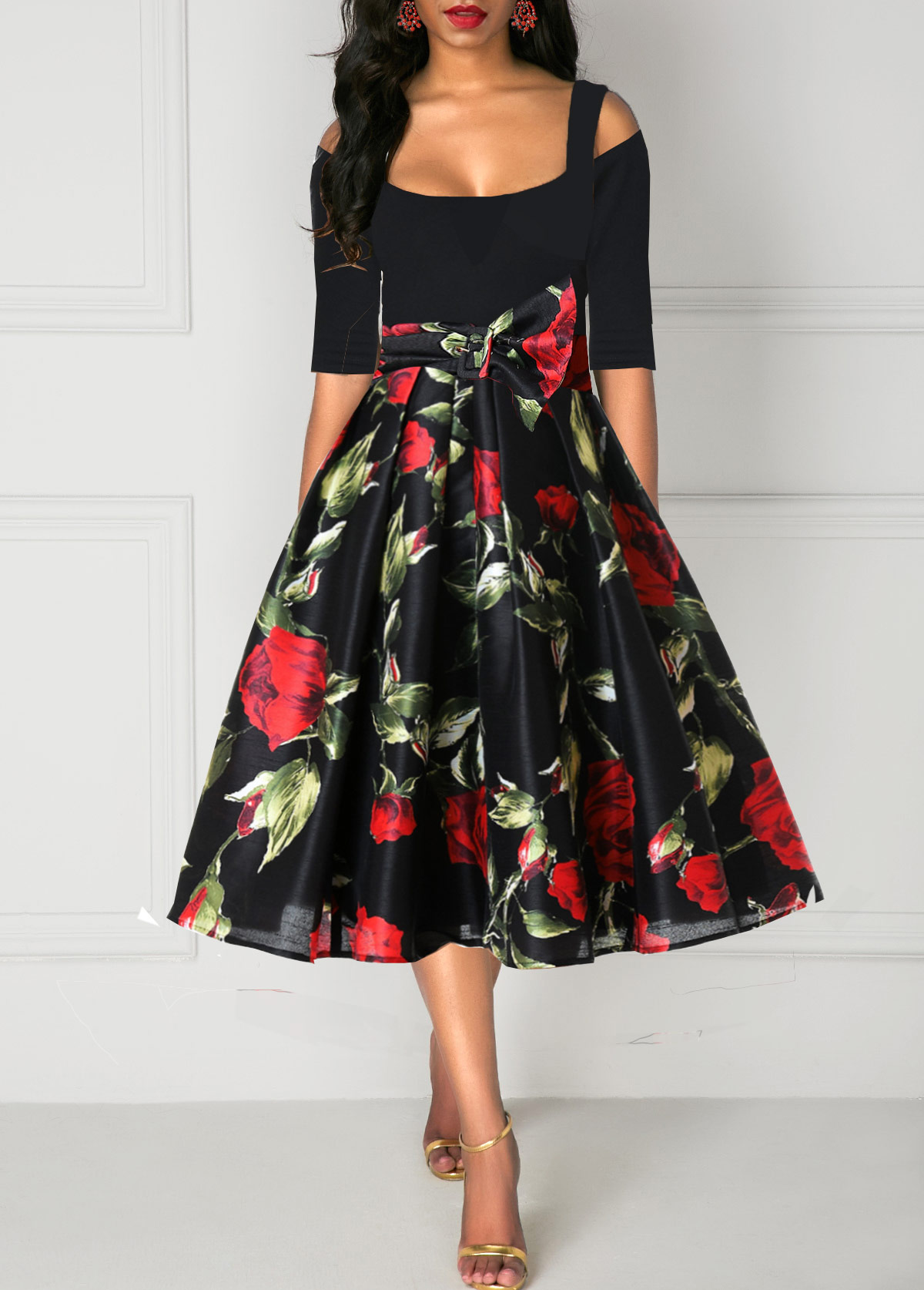 / Half Sleeve Rose Print Tie Waist Cold Shoulder Dress
