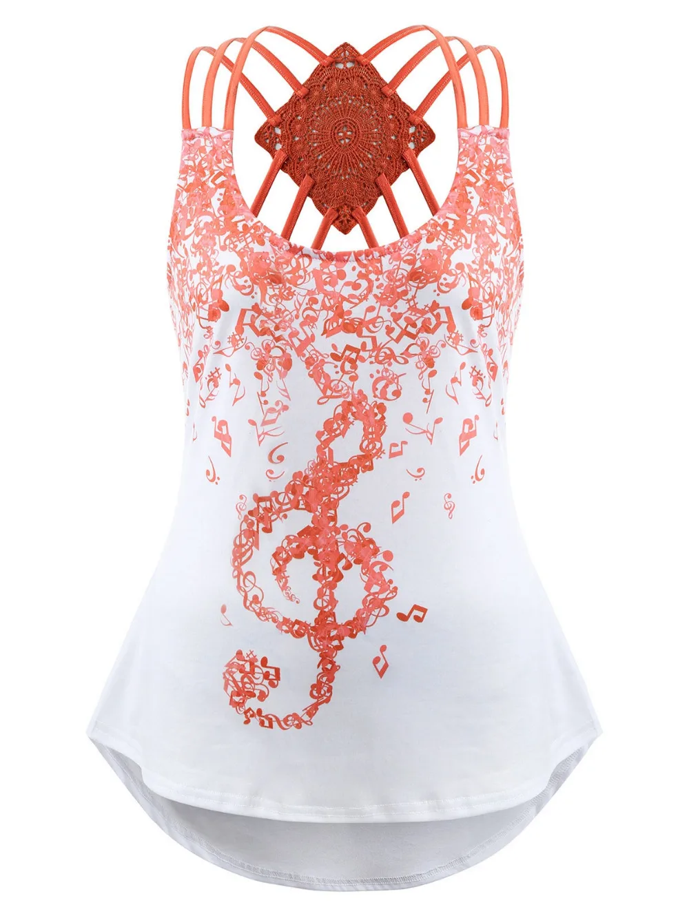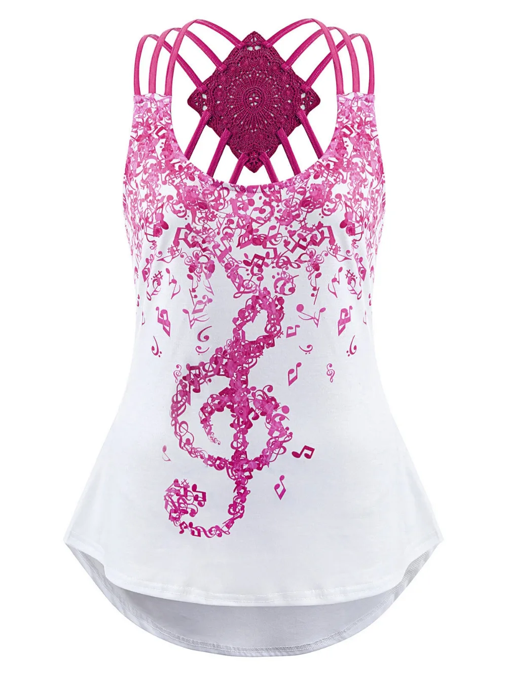 2018 Fashion Musical Note Asymmetric Tank Top Summer Women Tanks tops O Neck Sleeveless Back Criss Cross Elastic Ladies Top