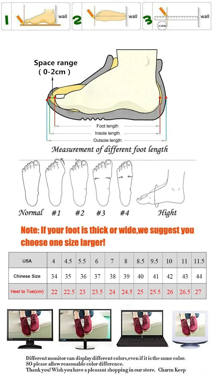 Note:Â Neither the US Size or EU Size size are based on the development of feet length, so you only need to accurately measure feet length, and then refer to the size chart to choose the correct size. Correct measurement of foot length is very important, our company is EU/CN size and foot length as the standard.